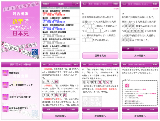 『河合出版誤字で泣かない日本史』は、株式会社河合出版発行『得点おまかせvol.1 誤字で泣かない日本史 日本史漢字練習帳』を元に作成されたiPhone/iPod touch向けのアプリケーションです。