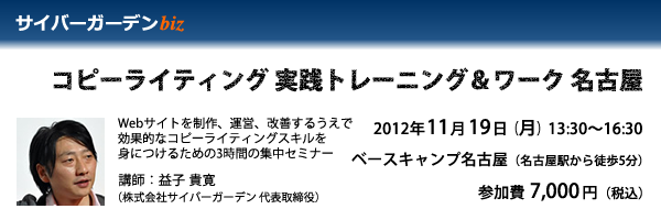 サイバーガーデンbizは、2012年11月19日(月)に名古屋・名駅3丁目で「コピーライティング 実践トレーニング&ワーク 名古屋」を開催します。Webサイトを制作、運営、改善するうえで、効果的なコピーライティングスキルを身につけるための、3時間の集中セミナーです。
