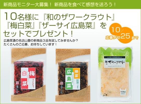 広島菜漬の製造・販売を行う、株式会社 山豊(本社:広島市/代表取締役:山本 千曲)は、秋の新商品「和のザワークラウト」「梅白菜」 「ザーサイ広島菜」の発売を開始した。価格は各252円(税込)。ネット通販専門サイトにて、新商品を試食してくださるモニター10名様を募集中。