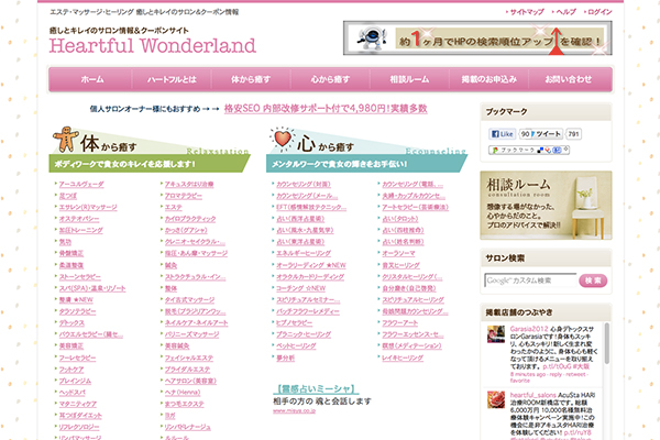 昨年、"癒しとキレイのサロン情報&クーポンサイト"としてリニューアルされ、以来、リラクゼーションサロン、ビューティーサロン、治療院、エクササイズスタジオ、カウンセリングルーム、ヒーリングサロンなど、約700店舗のクーポン情報と施術内容を紹介しています。