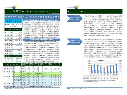 学園運営ソフトを主力とする特定業務向けパッケージソフトの開発・販売会社。12年10月期の第3四半期累計業績(11年11月~12年7月)は,前年同期に較べ売上高が弱含み横ばいに推移,営業損益は赤字を余儀なくされた。もともと,例年の1Q(11~1月)と3Q(5~7月)はそれぞれ冬休みと夏休みを含むため,収益も低水準に止まるが・・・