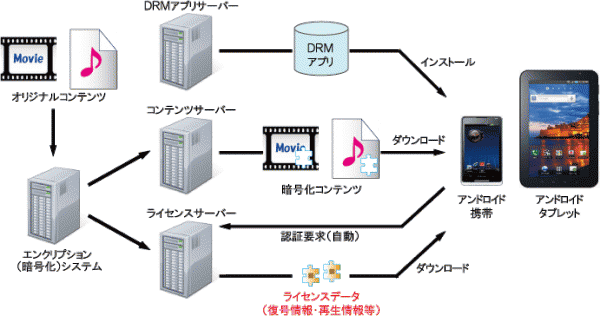「ハイブリッド配信システム」は、ダウンロード・ストリーミングの両配信システムに対応し、コンテンツを安全に配信するため、DRM(暗号化)を設定して配信する仕様となっています。