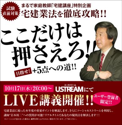 今からでも間に合う宅建試験の対策とは、宅建業法の復習に尽きると「まるで家庭教師」の講師・岩本周二は語ります。そこで、2012年に出題が予想される重要ポイントを、宅建業法に絞って解説します。受講生はいずれも今年の受験生。さらにその模様を、ユーストリームを通して配信。10月16日(火)19:00までにユーザー登録をしていただいた方を対象に、無料で公開いたします。