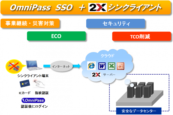 OmniPass SSOのシングルサインオン機能により、ID、パスワードの入力時間を省くことができます。また、2Xシンクライアントシステムはサーバライセンスでの提供ですので、ユーザー数が増えるほど導入コスト削減の効果を発揮します。ユーザライセンス製品と比べ低価格で導入することが可能です。