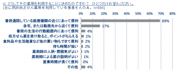 主に院外処方せん薬局を利用している患者さんのうち、69%が「普段通院している医療機関の近くにあって便利」、17%が「自宅、または勤務先から近くて便利」と回答しており、ほとんどの患者さんは「近くて便利」であることを最も重視していた。一方で「ポイントがもらえる」ことを最も重視している患者さん は、わずか2%であった。