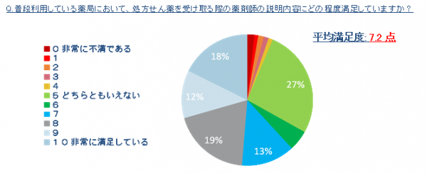今回の調査では、薬局や薬剤師についての評価についても尋ねた。全体の3分の2に当たる67%の患者さんが、処方せん薬を受け取る際に薬剤師から受ける説明内容に対して、「満足している」と回答した。一方で「不満である」と回答した患者さんは6%であり、薬剤師の説明内容に対する全体的な満足度は高い。