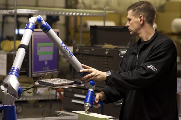 現在、同社はポータブル3次元測定器であるFaroArmを使用してポイントデータを取得し、またVerisurfソフトウェアを使用することで最適なアルゴリズムにより、図面値からの偏差が瞬時に計算されます。「弊社の製品は、顧客の厳格な仕様要件を確実に満たすために、すべて慎重に測定する必要があるのです」と AGC Aerospace & DefenseのComposites and Structures Group 代表取締役社長兼CEOのAlan L. Haase氏は述べています。「FaroArmを使用することにより、同じスタッフで出荷できる製品の量が飛躍的に増加しました。」