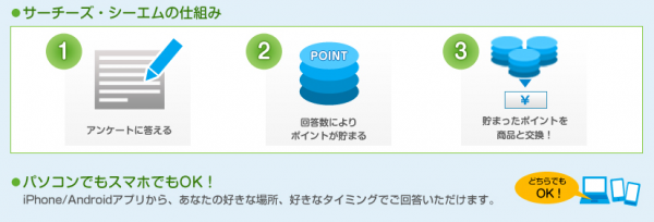 今回キャンペーンを行うのは、私たちSearches.cm運営事務局や、企業・組織が出稿するアンケートに回答して頂くモニターユーザーの募集のためです。モニターユーザーとしてSearches.cmに登録し、ログインして頂くと、回答可能なアンケートが表示されます。このアンケートをパソコン、もしくはスマートフォン(Androidアプリは11月上旬、iPhoneアプリは11月中旬開始予定)を使って手軽に回答して頂きます。回答に応じて、サイト内ポイントが付与され、一定数蓄積すると、様々な商品や現金と交換することが可能になります。