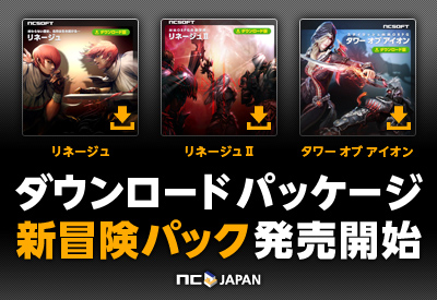 PC向けオンラインゲーム『リネージュ ~Eternal Life~(以下、リネージュ)』、『リネージュ2 ~Goddess of Destruction~(以下、リネージュ2)』『The Tower of AION(以下、タワー オブ アイオン)』をサービス、運営しているエヌ・シー・ジャパン株式会社(本社:東京都渋谷区恵比寿、代表取締役:金 澤憲(キム テクホン)以下、エヌ・シー・ジャパン)は、本日より総合オンラインストア「Amazon.co.jp」のPCソフト ダウンロードストア(http://www.amazon.co.jp/pcsoftdl)において、人気のオンラインRPGタイトル3作でデジタルパッケージ「新冒険者パック」(以下、本商品)の提供を開始いたしました。