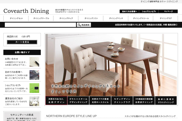 商品数は約120商品お取り扱いしています。また、各商品の説明ページでは、極力大きな画像を多数掲載することにより、通販では伝わりづらい商品の詳細まで伝えています。また、実際の店舗では分かりづらいダイニングでのコーディネートイメージも豊富に掲載をしており、楽しみながらお買い物ができるようになっています。