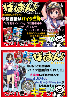 日販では10月19日に第2巻が発売されるタイミングで、店頭オリジナル販売台・POP、オリジナル購入者特典「著者描き下ろしメッセージペーパー」を書店へ提供し、第1巻・第2巻の売り伸ばしを図ります。また、本企画は2013年に開催が予定されている「第1回バイク検定(仮題)」とも連動し、バイク業界、バイク雑誌業界との追加コラボ企画も提案していく予定です。