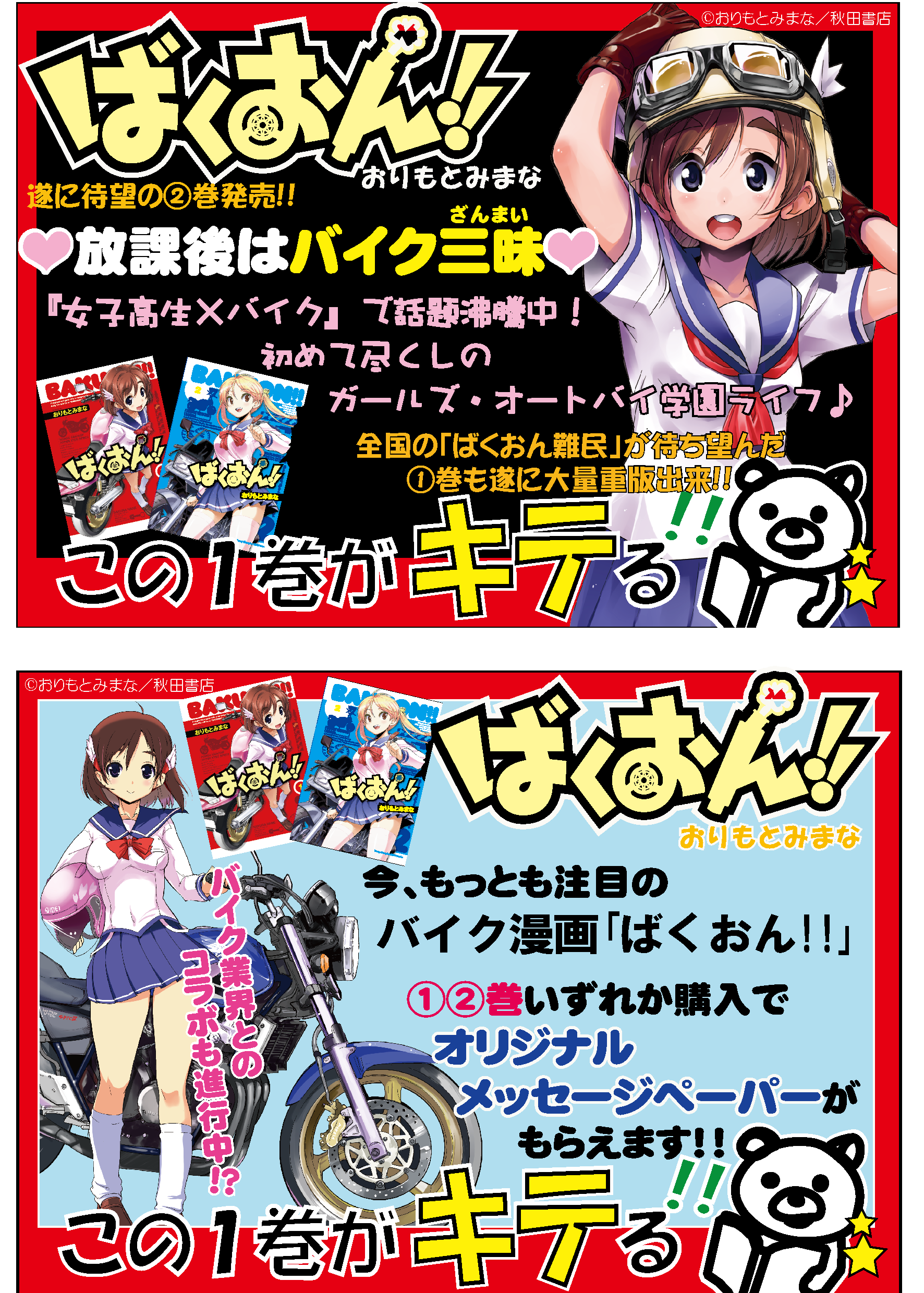 第四弾となる今回の銘柄は、「ヤングチャンピオン烈」で連載中の「ばくおん!!」(おりもとみまな/秋田書店)。女子高生とバイクという、新鮮な組み合わせの学園コメディですが、採用されているバイクはどれもバイクファンが唸る玄人好みのものばかり。萌え系、学園コメディのみならず、バイク雑誌・バイクコミックとの併売が多いのが特徴です。2012年3月の第1巻発売当初から完売状態が続いている注目作品です。