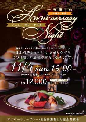 2012年11月4日(日)リビエラ ダイニング グランブルー青山にて「一夜限りのアニバーサリーナイト」を開催いたします。