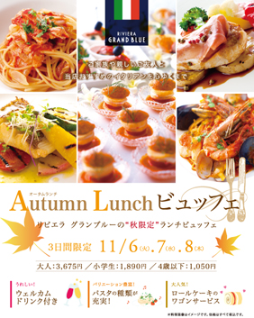 リビエラ グランブルーの“秋限定”ランチビュッフェ。ご家族や親しいご友人と当店おすすめのイタリアンを心ゆくまで。