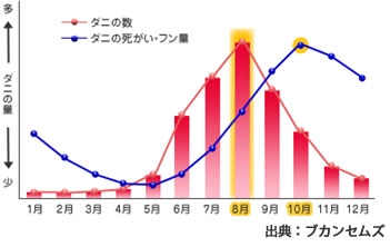 ダニの繁殖が活発になるのは梅雨時期の6月、ダニの数のピークは8月ですが、ダニの死がいとフンの量のピークが10月です。
