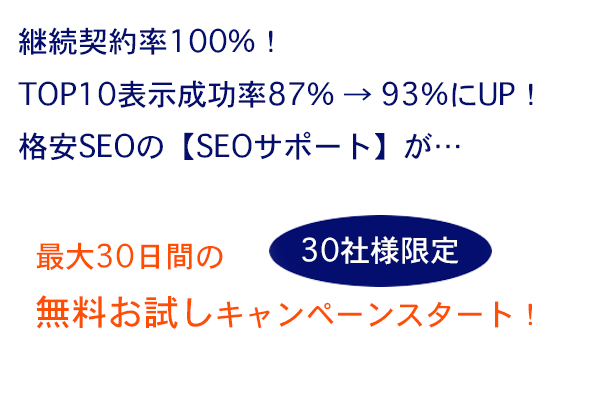 そこでSEOサポートでは、格安の定額制SEOサービスで本当に上位表示が可能かが不安で躊躇されているお客様、上位表示後のアクセスの変化を検証してみたいというお客様、現在のSEOサービスで費用対効果に不満を持っておられるお客様などに、気軽に当サービスをお試しいただけるよう、30社様限定ではありますが、最大30日間の無料お試し期間をご提供することといたしました。