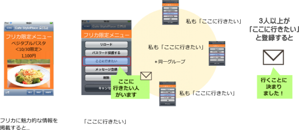 グループ内の1人がお店発行のフリカを開いて「ここに行きたい」登録を行なうと、グループメンバーに「XXXに行きたい人がいます」(XXXは店名)とメールが送信されます。