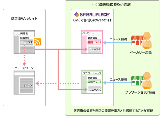 例えば、商店街のホームページがイベント情報をRSS配信している場合、「スパイラル プレース(R)」を利用する商店街の飲食店では、自動的に商店街のイベント情報を収集して個々のホームページに掲載できます。