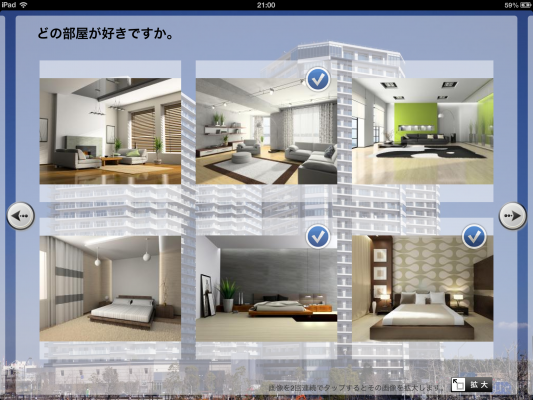 アンケートの選択肢に画像を設定することができます。この設定を行ったアンケート項目の画面では設定した画像を拡大表示したり、フリック操作でページをめくることができます。