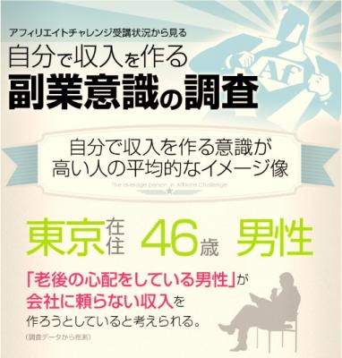 「アフィリエイトチャレンジ」の受講属性を年齢別に見ると10代から80代までの幅広い層がネット副業へ関心を持ち、有料の通信講座であっても受講するという、ネット副業への高い意識が読み取れます。中でも圧倒的に多い40代のいわゆるバブル世代、次いで50代、団塊ジュニア世代の30代などの会社員が会社に頼らない収入を作ろうとする傾向があると推測します。