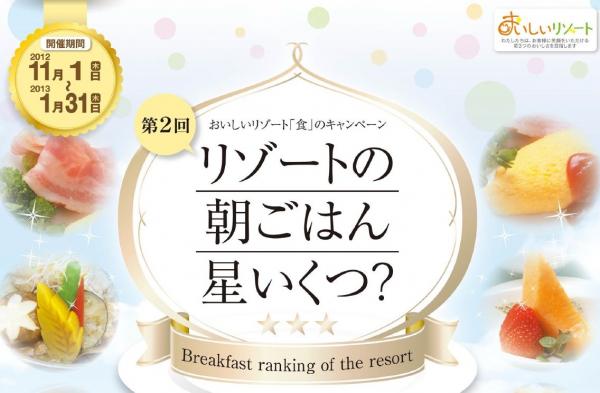 「おいしいリゾート」をメインテーマに日本各地にてリゾートホテル業を営む株式会社セラヴィリゾート泉郷(本社:東京豊島区、代表取締役:江間英夫)は、各リゾート施設対抗の朝食一番人気を決める「第2回 リゾートの朝ごはん。星いくつ?」キャンペーンを平成24年11月1日(木)~平成25年1月31日(木)まで実施致します。昨年大好評のキャンペーンにつき、今年の第2回目の実施となります。