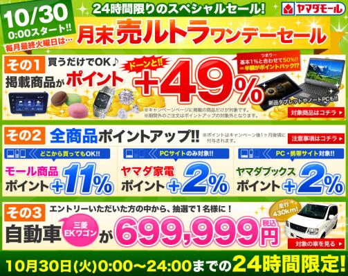 をコンセプトにヤマダ電機が運営する「ヤマダモール」が、10月30日(火)0時~24時の24時間限定で、月1回の大幅ポイントアップキャンペーン「売ルトラワンデーセール」を開催いたします。