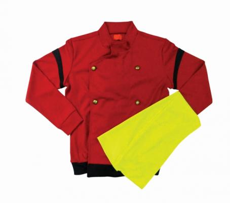 赤色が鮮やかなジャージは、全面の切り替えと金ボタンが特徴的でおしゃれなデザイン。