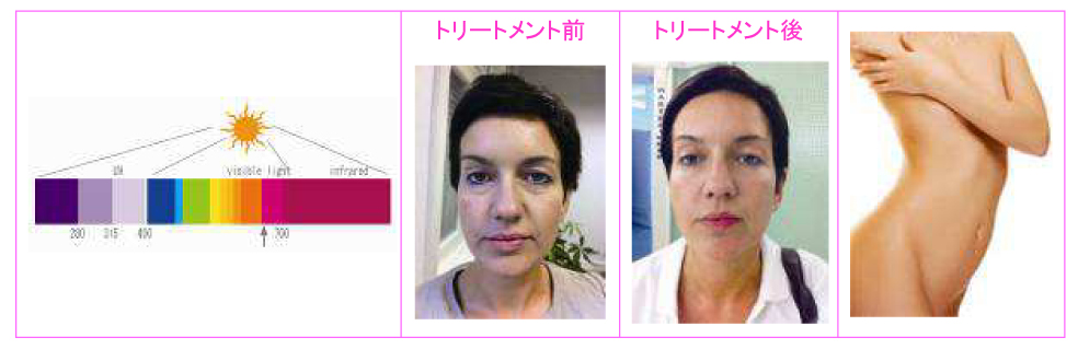 コラーゲントリートメントはヨーロッパで開発された新たな「お肌のエイジングケア」です。赤色光(633nm)とコラーゲン・ヒアルロン酸・ビタミンC誘導体が含まれる高純度専用ローションによって肌が潤い、ハリが出て、乾燥肌を防ぎ、スベスベした、きれいなお肌になります。基本的に5週間のプログラム。1回12分を週2~3回行います。