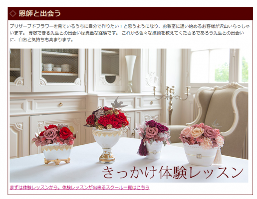 人は新しいものと出会うことで成長し、そこから日々の楽しさを見つけていきます。それではプリザーブドフラワーはどうでしょうか?初めて習うお花、初めて知り合う人たち、初めて作るアレンジ、初めて見つけた自分の新たな一面… 新しい自分に出会い、時として新たな人脈に巡り合う楽しみは、プリザーブドフラワーの持つ大きな魅力のひとつです。一期一会の出会いを楽しみ、さらに自分を成長させてくれる存在… プリザーブドフラワーの魅力は奥が深く、一言では言い表せません。