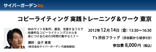 サイバーガーデンbizは、2012年12月14日(金)午後に東京・渋谷で「コピーライティング 実践トレーニング&ワーク 東京」を開催する。Webサイトを制作、運営、改善するうえで、効果的なコピーライティングスキルを身につけるための、3時間の集中セミナー。