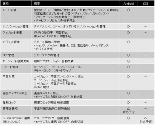 また、一般的なMDM機能(リモートワイプ・ロック・不正操作対策 etc.)を標準搭載し、さらにクラウドシステムをセキュアに利用するためのスマートデバイス向けブラウザ「B-Link Browser」との連携機能等も備えているため、セキュリティ面でも安心です。