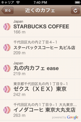 カフェアイコンを押せば、近くのカフェを、すばやく検索できます。