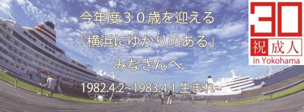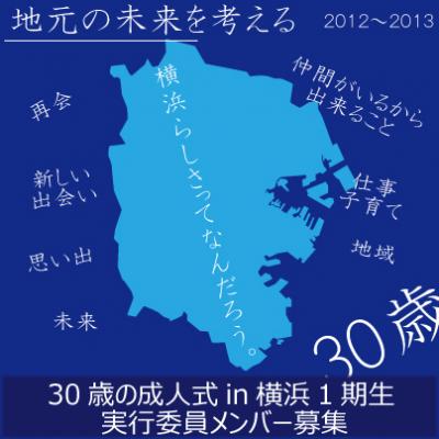 横浜市地域活性化イベント「30歳の成人式in横浜」~今年度30歳を迎える「横浜にゆかりのある」皆さんへ~(1982.4.2 - 1983.4.1 生まれ)を実施する30歳の成人式in横浜実行委員会(代表:DAS株式会社渡邉大輔)は、「30歳の成人式in横浜」のイベント開催に合わせて、横浜出身30歳による30歳の為の新しい地域活性化をご提案します。2013年1月5日(土)に「30歳の成人式in横浜」を開催させて頂きます。