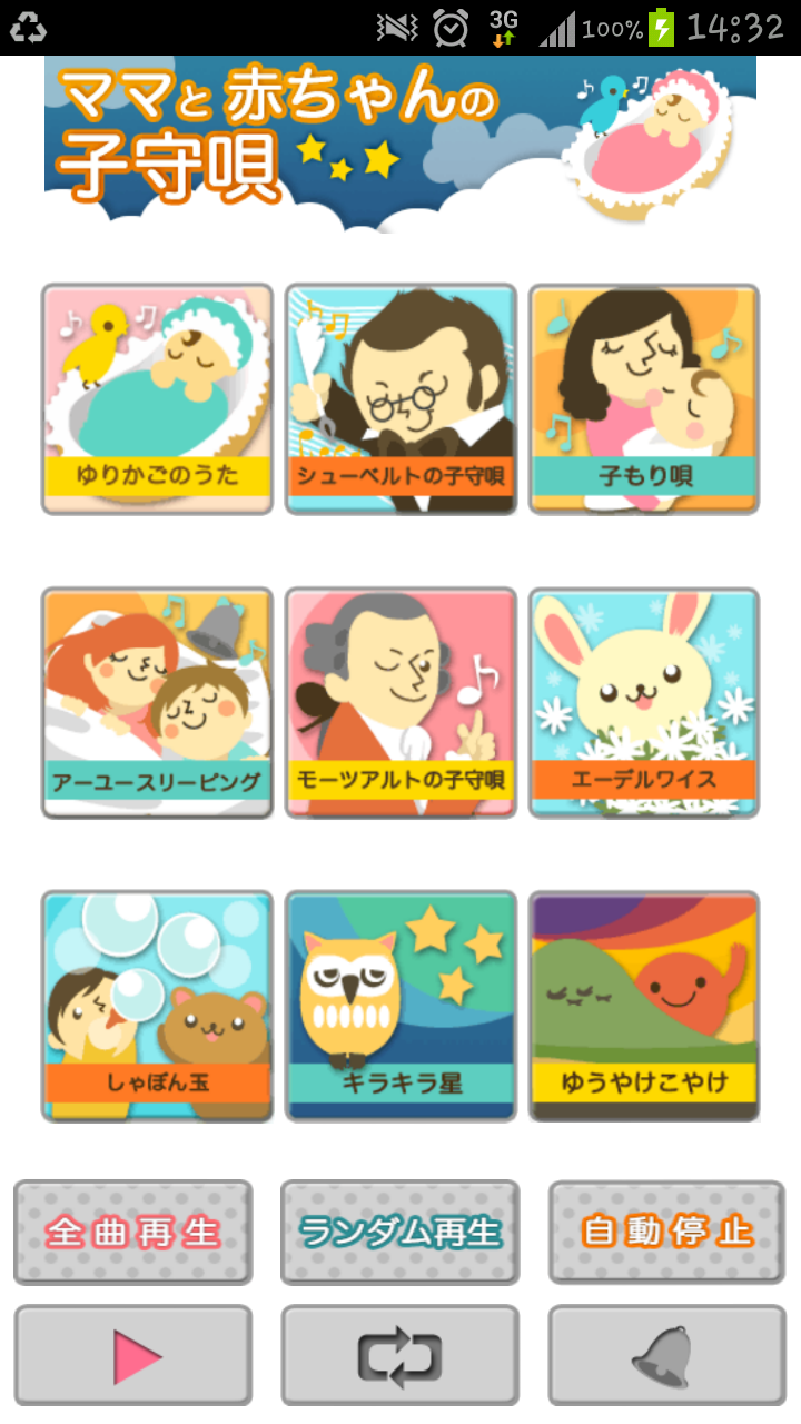 「ママとあかちゃんの子守唄」は、Android端末にて子守唄になる音楽を再生できるアプリケーションです。このアプリは子育て中のお母様方へのお手伝いを目的とし開発致しました。クラシックの名曲や子守唄に使われる童謡の定番曲を、優しいオルゴールメロディーにし、お子様の睡眠をサポート致します。