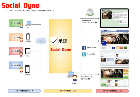 「ソーシャルダイン」は商業施設やFC展開する企業が、複数のテナントや加盟店が発信する情報を一元管理し、各種ソーシャルメディア(Facebook、Twitter)や、運営するWeb・ブログへ同一情報を反映させるシステムです。
