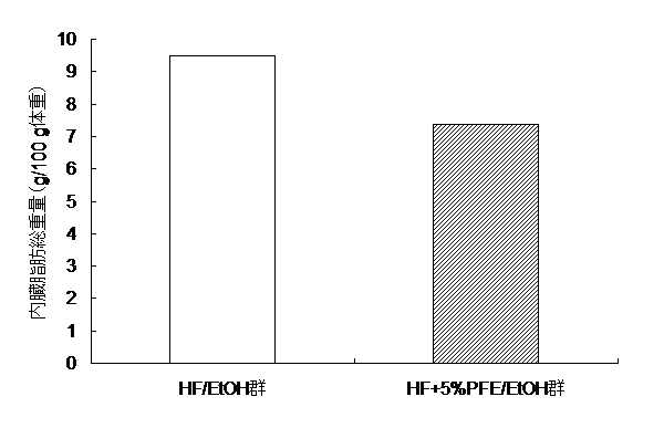 その結果、HF+5%PFE /EtOH群はHF/EtOH群と比較して、内臓脂肪総重量および血中GOT濃度の有意な低下がみられました。また肝臓解剖所見により脂肪肝の改善が確認されました。