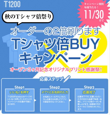 株式会社NONAME Produce(本社:東京都渋谷区、社長:村上烈)の運営する、A3サイズ・フルカラー・ボディー代込み一枚から1200円のオリジナルTシャツ制作サイト「T1200(ティーセンニヒャク)」ではオープンから3ヶ月を記念し、11月1日より毎週一名にオーダーした量の2倍商品が届くクーポンが当たる「秋のTシャツ倍祭り Tシャツ倍BUYキャンペーン」を開始しました。