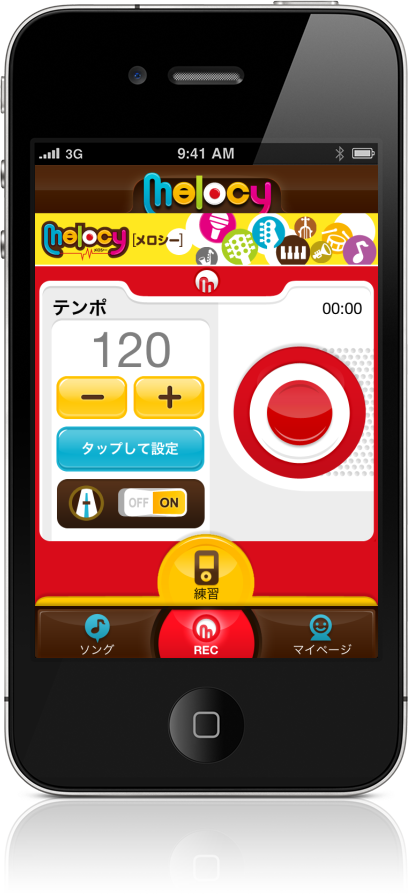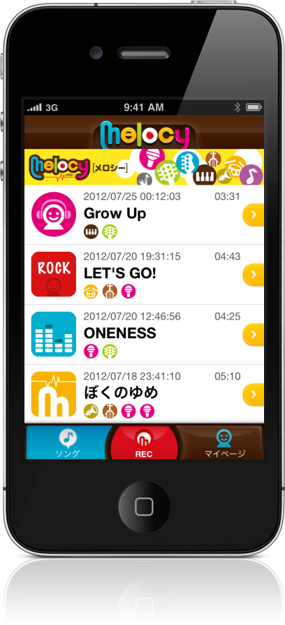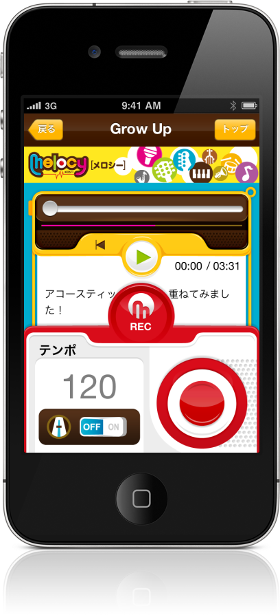melocyでは、iPhoneアプリで録音した演奏に、他のユーザーが演奏を重ねて録音できます。例えば最初のユーザーがドラムを公開し、別のユーザーがベース、ギター、ボーカルなどを重ねることで、楽曲を完成させます。