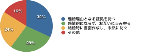 離婚問題を長引かせないための方法については、離婚理由になる証拠をしっかりと持つ。また感情的にならず、お互いに歩み寄ることが、最終的には一番の近道。という意見が多いなか、婚姻時に誓約書などの書面を、公正証書として作成しておくことも未然に問題を防ぐ方法として、大変有効であり、近年では国内でも一般化しつつあるとのこと。
