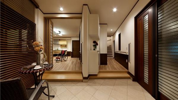 たとえば、痴呆対策では窓センサー、介護室やトイレにも呼び出しスイッチを設置し、子世帯からの見守りをしやすく配慮し、安全対策では足元灯や電源コードでの転倒事故防止のマグネットコンセント、衛生面では車いす対応衛生器具、脱臭機能のあるナノイー発生器を設置。色彩・空間デザインに関しては、当社所属デザイナーによる監修により、どの家族にもそのままの状態で自然に生活して頂けるようデザインしました。そして、1階玄関先の多目的土間部に2階リビングつながる吹抜を設置し、吹抜部を間接照明の光により一体感のある空間とし、夜間でも家族のつながりを感じることができると思います。