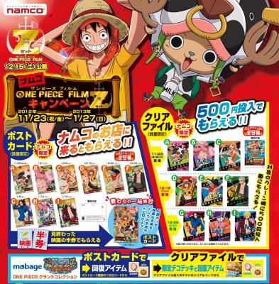 株式会社ナムコ(本社:東京都大田区)は、大人気アニメ「ONE PIECE」の映画最新作「ONE PIECE FILM Z」が12月15日(土)に公開されるのを記念して、全国直営アミューズメント施設約200店舗で、「ナムコ ONE PIECE FILM Z キャンペーン」を開催します。