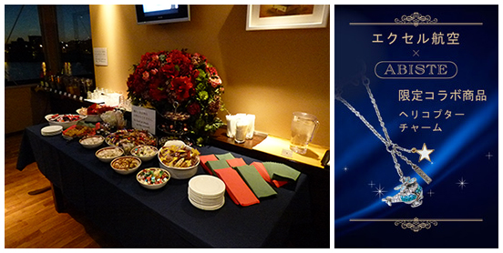 なお、12月22日から12月25日の間にご搭乗いただく「ジュエルBOX」(貸切の昼限定フライトコース)にお申込みの方には、エクセル航空とABISTE(アビステ)の限定コラボ商品「ヘリバッグチャーム」をご搭乗人数分、シャンパンフルボトル(1本)をプレゼントいたします。