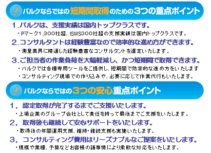 バルクは情報セキュリティのコンサルティング分野ではPマーク1,300社超、ISO27001は300社超の国内トップクラスのコンサルティング会社です。