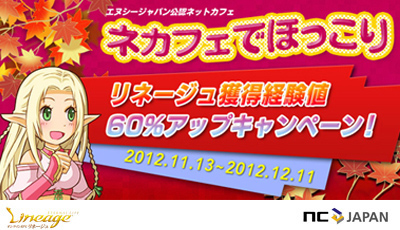 PC向けオンラインゲーム「リネージュ ~Eternal Life~(以下、リネージュ)」をサービス、運営しているエヌ・シー・ジャパン株式会社(東京都渋谷区、代表取締役:金 澤憲(キム テクホン))は、2012年11月13日(火)定期メンテナンス終了後から2012年12月11日(火)定期メンテナンス開始までの期間、全国のリネージュ公認ネットカフェ(以下、公認ネットカフェ)にて、「ネカフェでほっこり 獲得経験値60%UPキャンペーン」(以下、本キャンペーン)を開催いたします。