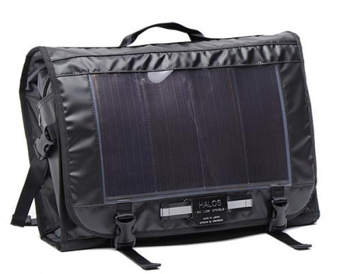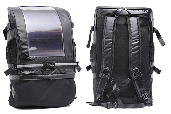 「HALOS バッグシリーズ」は太陽光パネルを搭載、直接スマホを充電することができます。また、オプションのバッテリーパックを装着すれば、様々な機器のバックアップ電源として使えます。