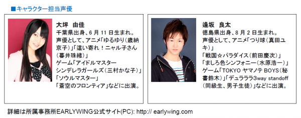 担当声優の詳細は所属事務所EARLYWING公式サイト(PC): http://earlywing.com