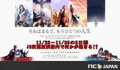 PC向けオンラインゲーム『リネージュ2 ~Goddess of Destruction~(以下、リネージュ2)』および『The Tower of AION(以下、タワー オブ アイオン)』を運営するエヌ・シー・ジャパン株式会社(東京都渋谷区、代表取締役:金 澤憲(キム テクホン))は、2012年11月20日(火)より、多くのお客様に楽しんでいただける新ビジネスモデル のプロモーション「ハートフルプライス、はじまる(※)」を実施いたします。これに伴い2012年11月23日(金)から2012年11月25日(日)の3連休にJR秋葉原駅、駅構内にて「『リネージュ2』『タワー オブ アイオン』JR秋葉原駅パフォーマンスイベント」を開催いたします。