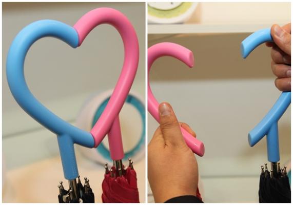 DEVENTORYが今回の展示会を通じて披露した一つ目のアイテムは傘である。この会社が披露した傘は取っ手に磁石が入っていて二つがあわせられたとき にふと角ハートの形になるカップル傘である。この製品は鉄になった構造物に付着が可能で、傘を入れるところがなくてもどこでも簡単に収納が可能である。