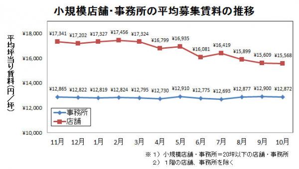 池袋の小規模事務所(20坪以下)の坪当たり平均募集賃料は、8月から2ヶ月連続上昇していましたが、10月は減少に転じました。