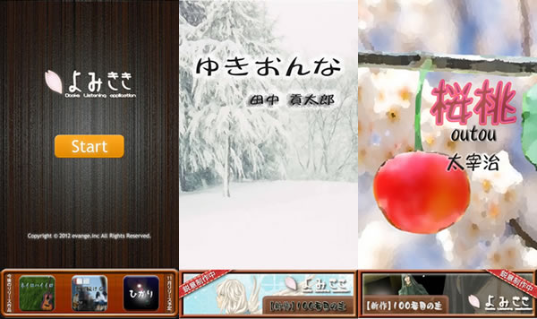 『よみきき』の作品としまして、まずは、田中貢太郎の「ゆきおんな」を主演 小泉 豊(こいずみ ゆたか) 出演 佐々木 彩乃(ささき あやの)、岩崎 愛(いわさき めぐみ)といった声優陣で演じていただいたおり、太宰治の「桜桃」を主演 星野 貴紀(ほしの たかのり)で一人語りを仕手頂いております。本アプリは、まずはこの2作を無料で公開しつつ月産で2~3もストーリーを追加し、年間で50作の公開を目指しております。